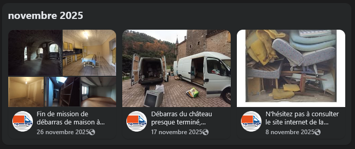 Mes dernières actualités sont visible sur facebook, vous pourrez trouver des photos de mes dernières missions de débarras.